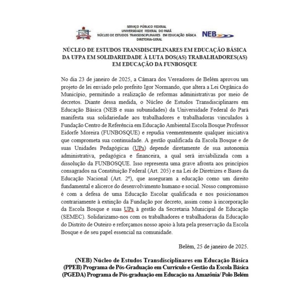 NÚCLEO DE ESTUDOS TRANSDISCIPLINARES EM EDUCAÇÃO BÁSICA DA UFPA EM SOLIDARIEDADE À LUTA DOS(AS) TRABALHADORES(AS) EM EDUCAÇÃO DA FUNBOSQUE