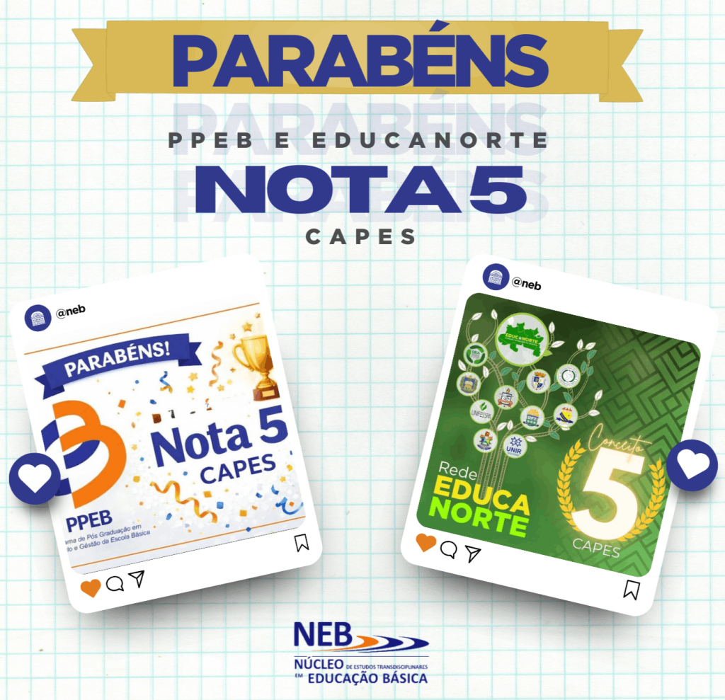 Postado em 14 de janeiro, 2026O Núcleo de Estudos Transdisciplinares em Educação Básica (NEB) celebra e parabeniza a conquista da Nota 5 da CAPES dos programas PPEB e EDUCANORTE, esse resultado reafirma a Região Norte como polo de excelência em produção científica e na formação de pesquisadores(as), sempre reforçando o compromisso com a educação pública e socialmente referenciada.